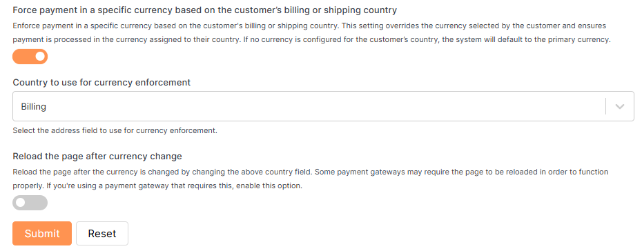 Enable this feature to automatically enforce payment in a specific currency based on the customer’s billing or shipping country.
